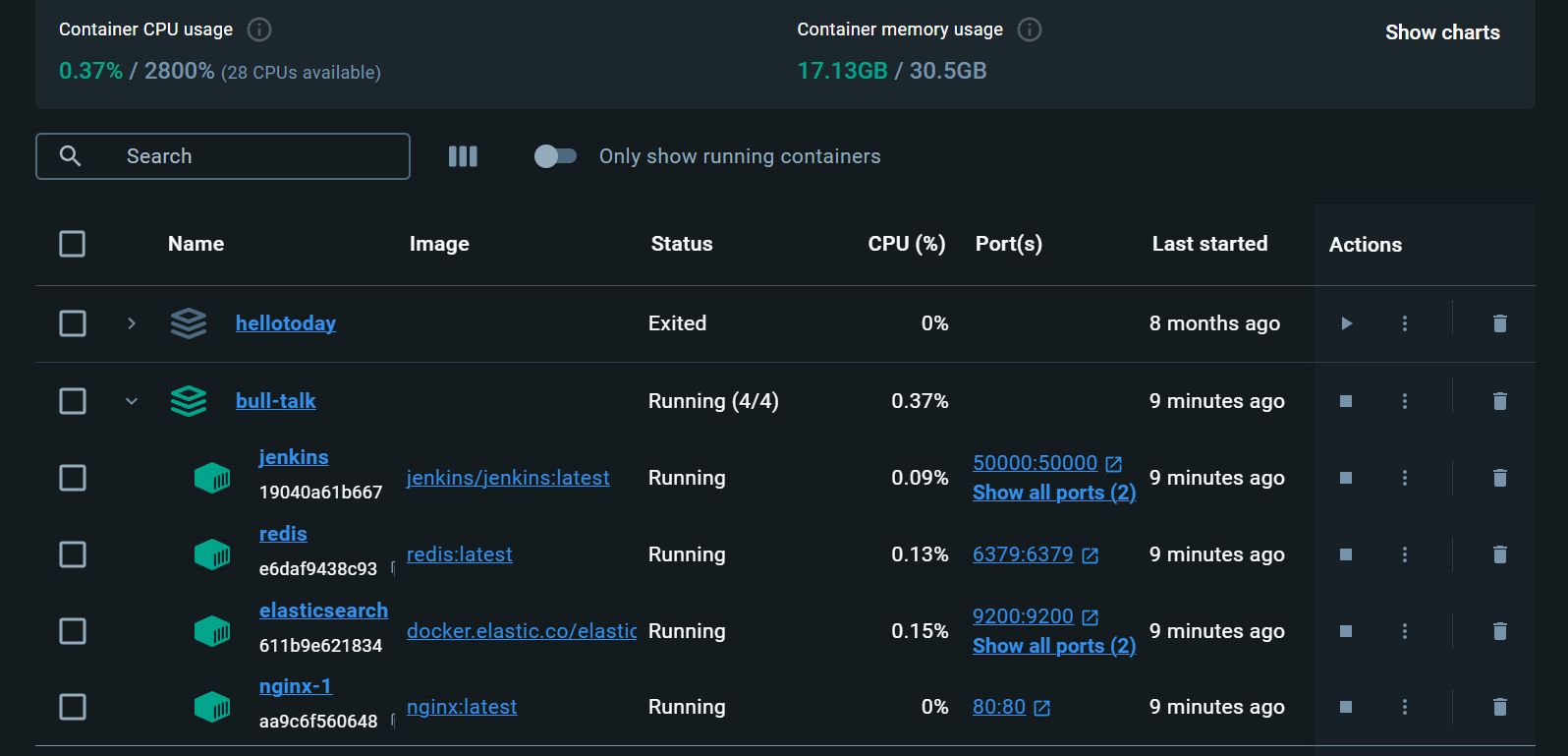 배포가 정상적으로 됐다면 docker를 실행해보자! 뭔가 초록불이 다 떴다!