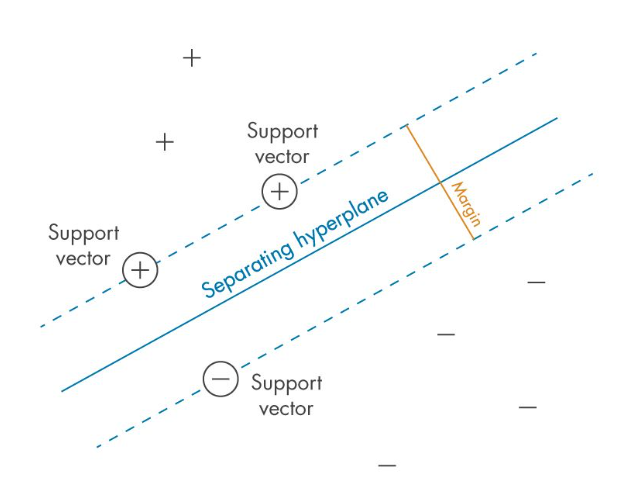 - 개념: SVM은 클래스 간의 경계를 최대 폭의 마진을 가진 초평면(hyperplane)으로 구분한다.