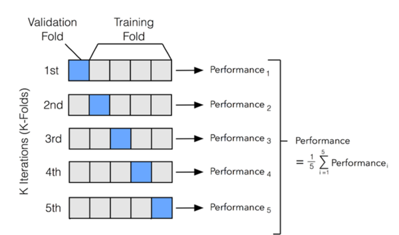 - k-fold cross validation: k개의 그룹을 교차 검증으로 활용하여 모델 성능을 평가하는 방법.