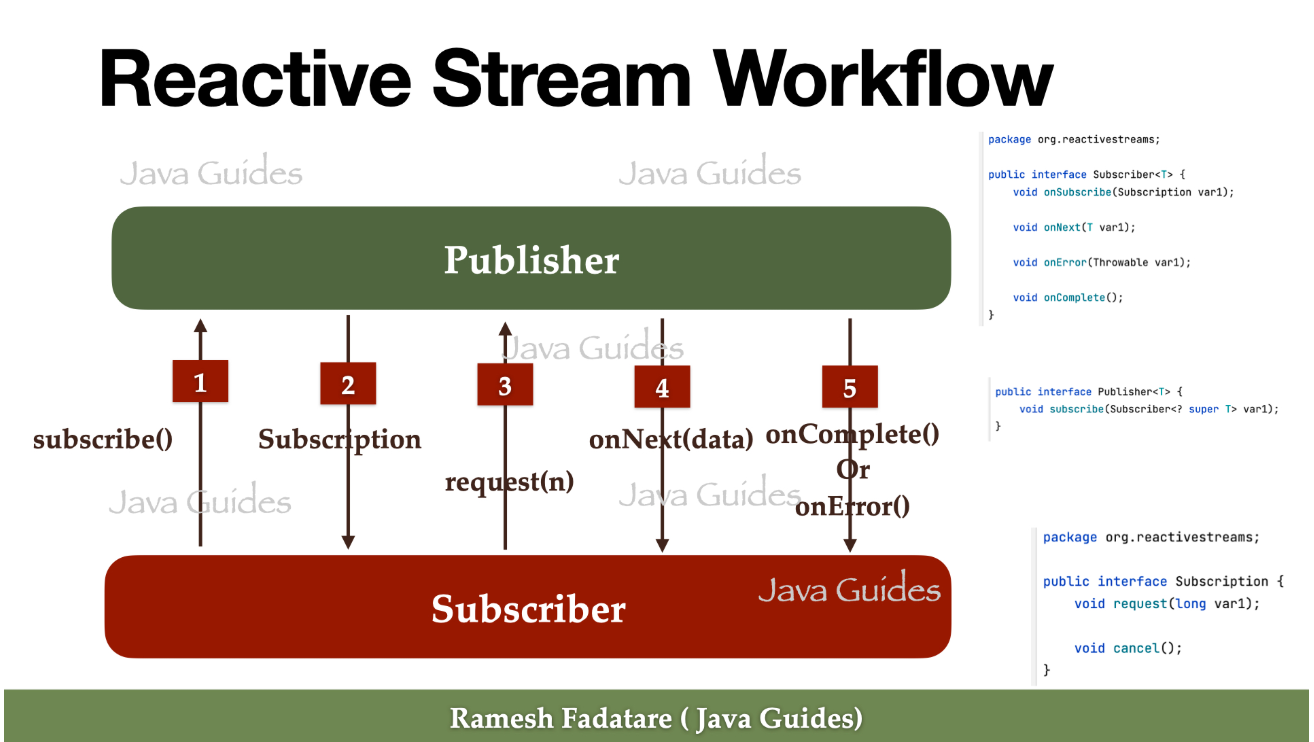 - Mono나 Flux는 Publisher 역할을 하고 subscribe()를 호출하면 내부에서 아래 흐름이 작동 된다.