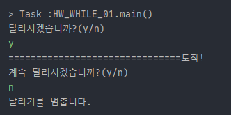 System.out.println("계속 달리시겠습니까?(y/n)");