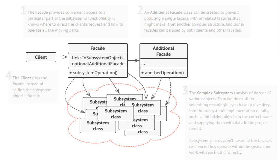 Facade는 프랑스어에서 유래된 단어로 건물의 외관이라는 뜻을 가지고있음! 건물의 외벽에서 보면 안의 구조는 보이지 않는다! (오~ 이 한줄로 얼추 개념을 이해했어)