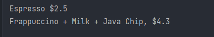 System.out.println(beverage.getName() + " $" + beverage.costs());